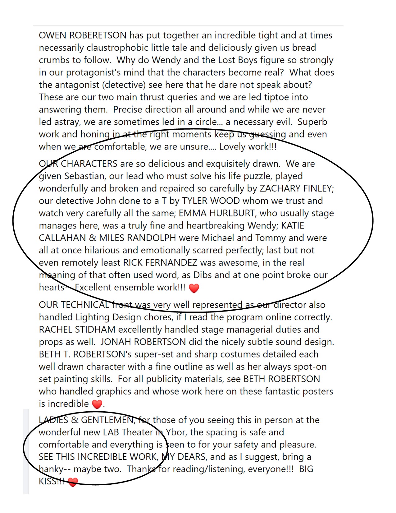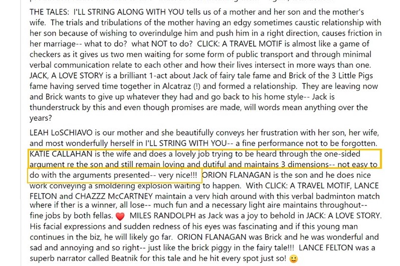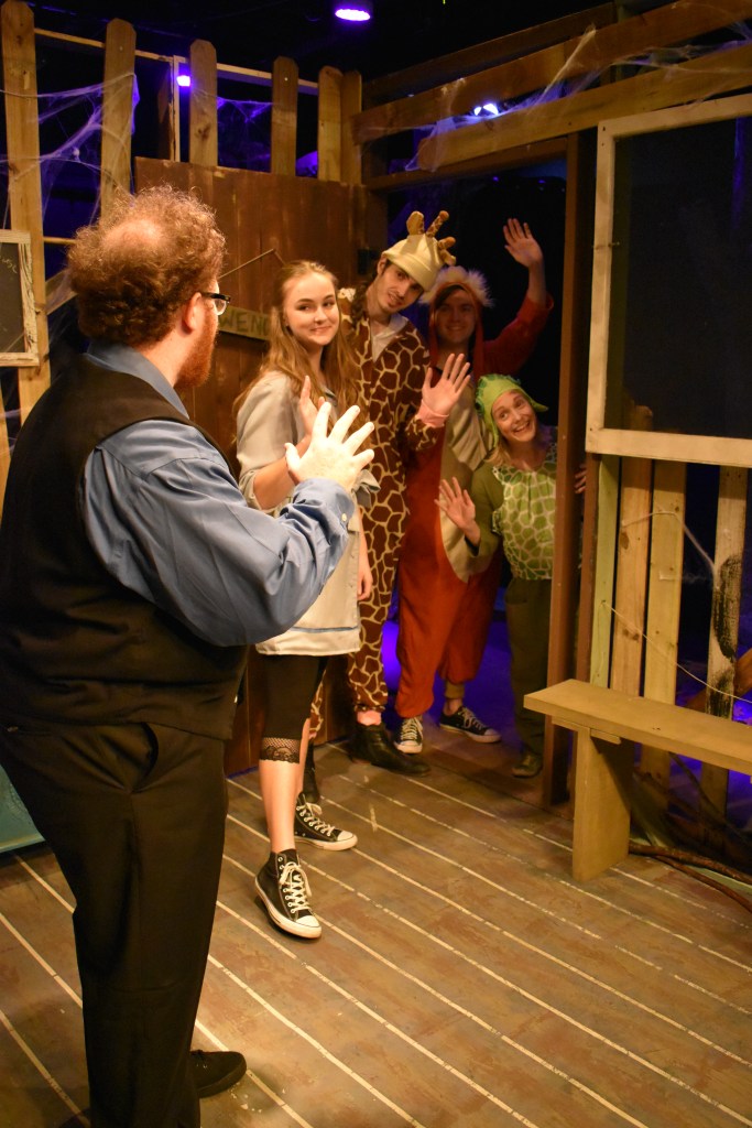 “Robertson mines the script’s ample humor with delightful performances by Katie Calahan (Tommy/turtle), Miles Randolph (Michael/fox) and Ricardo Fernandez (Dennis/giraffe).”