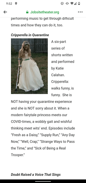 Watch my super fun promo & then click the button in the corner to rent or purchase Episode 1 of “Cripperella in Quarantine”!Maybe afterwards you could stick around and check out content by some other amazing artists available from Jobsite Theater’s Digital Shorts